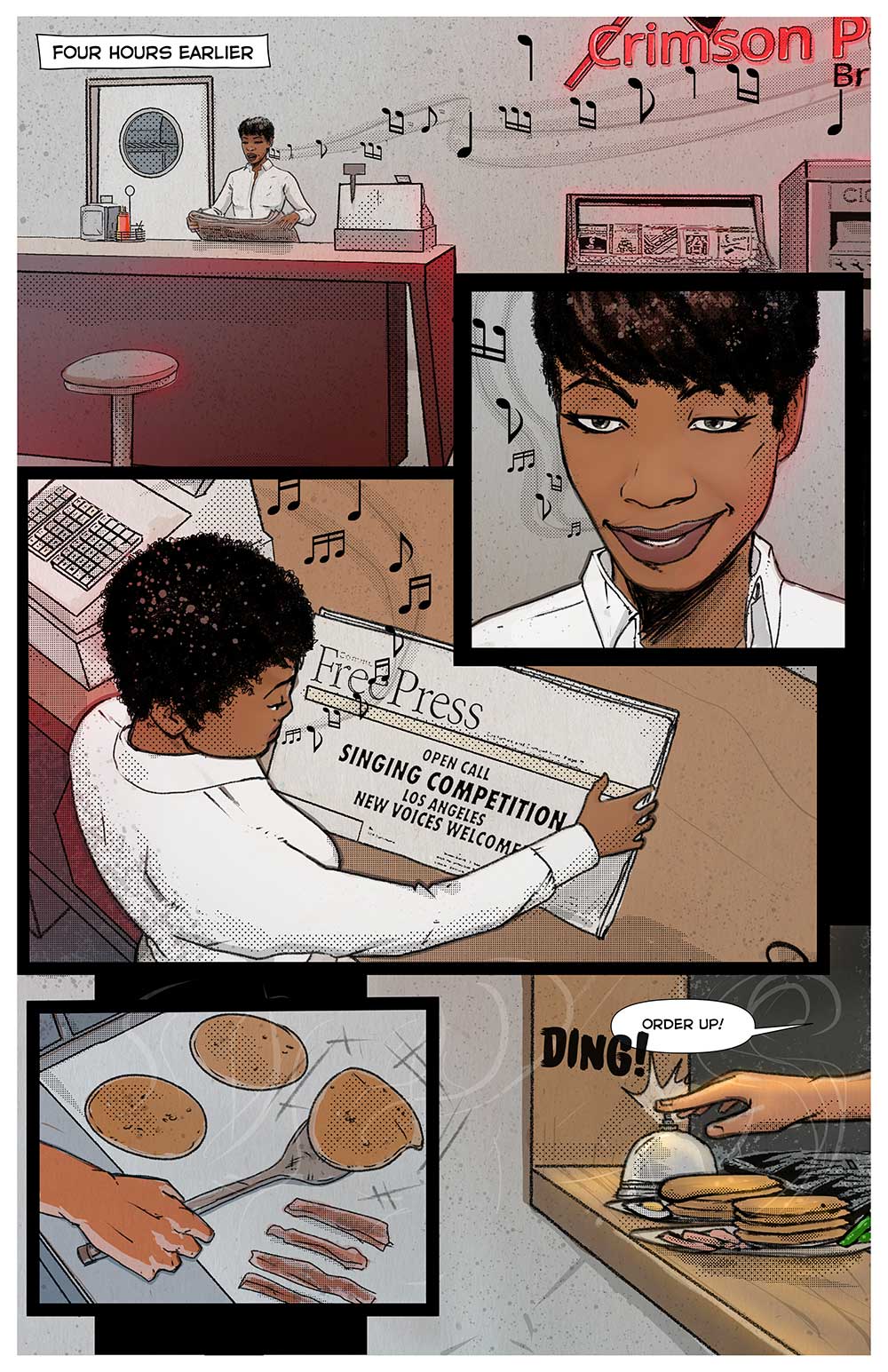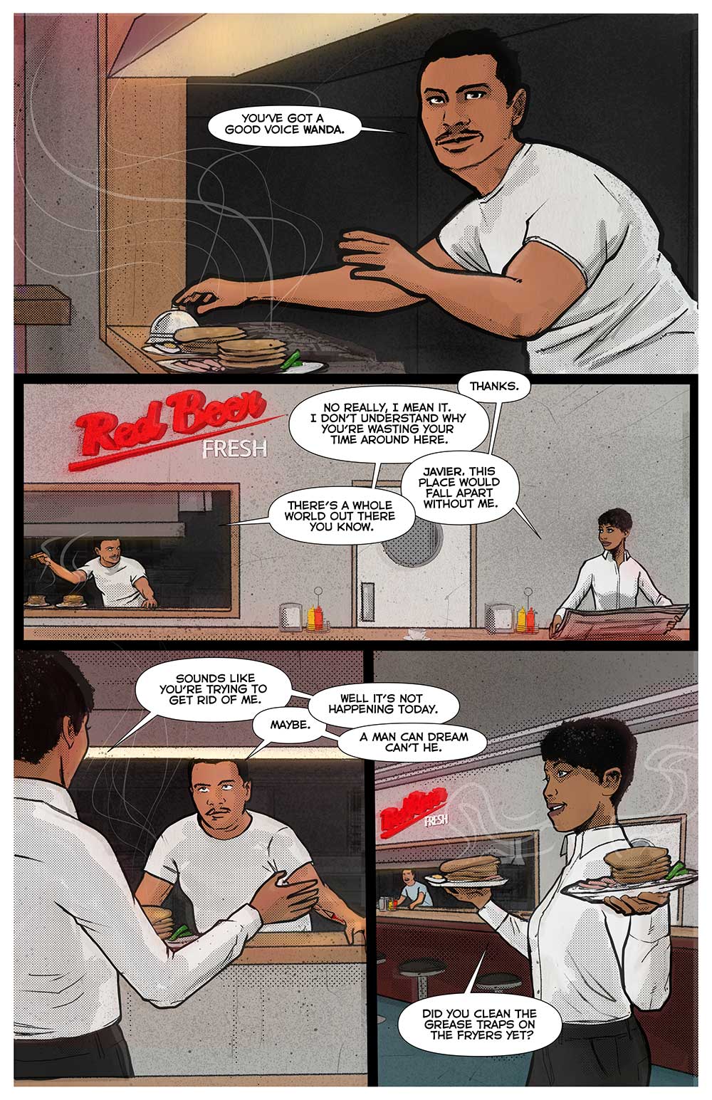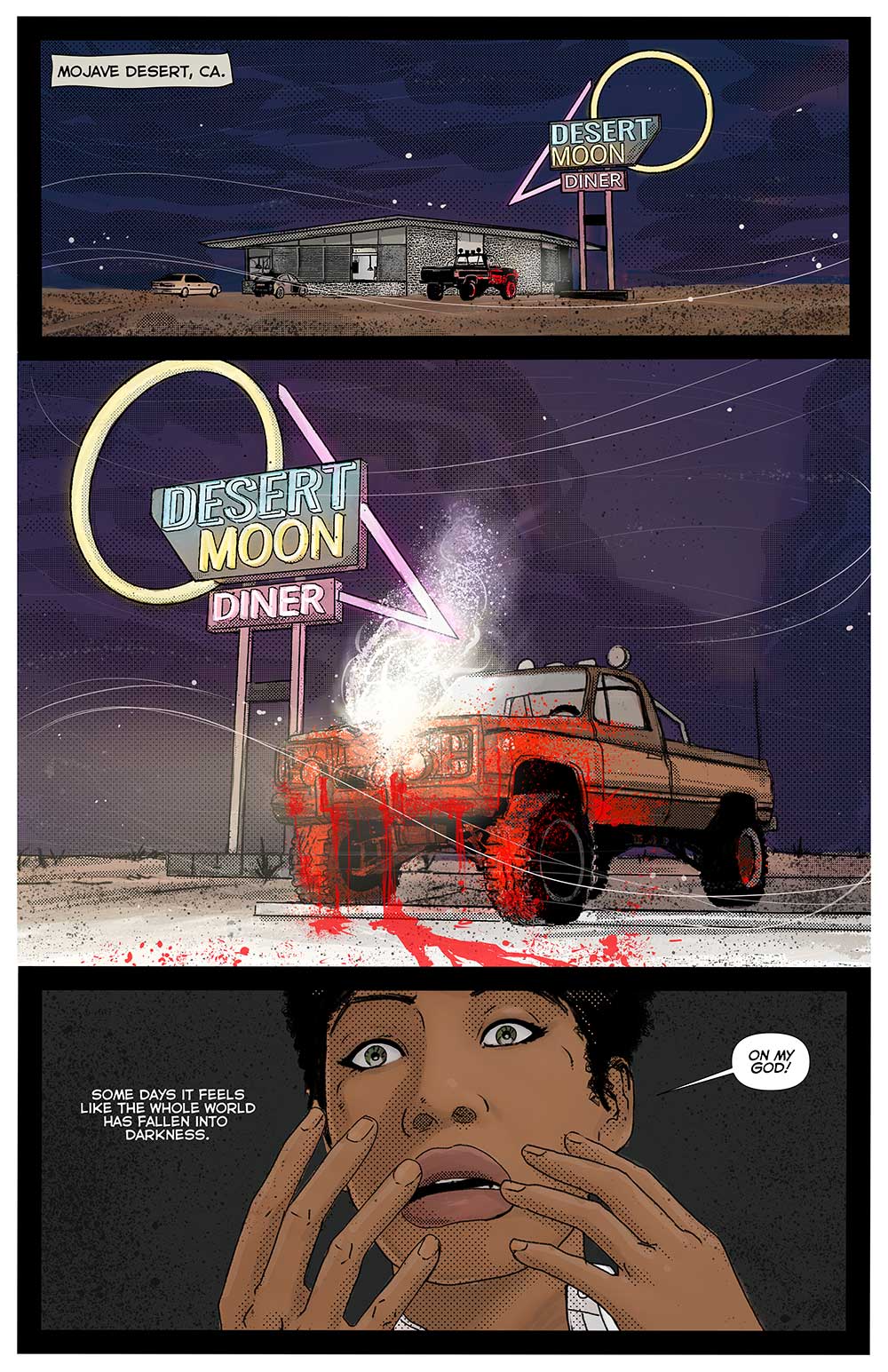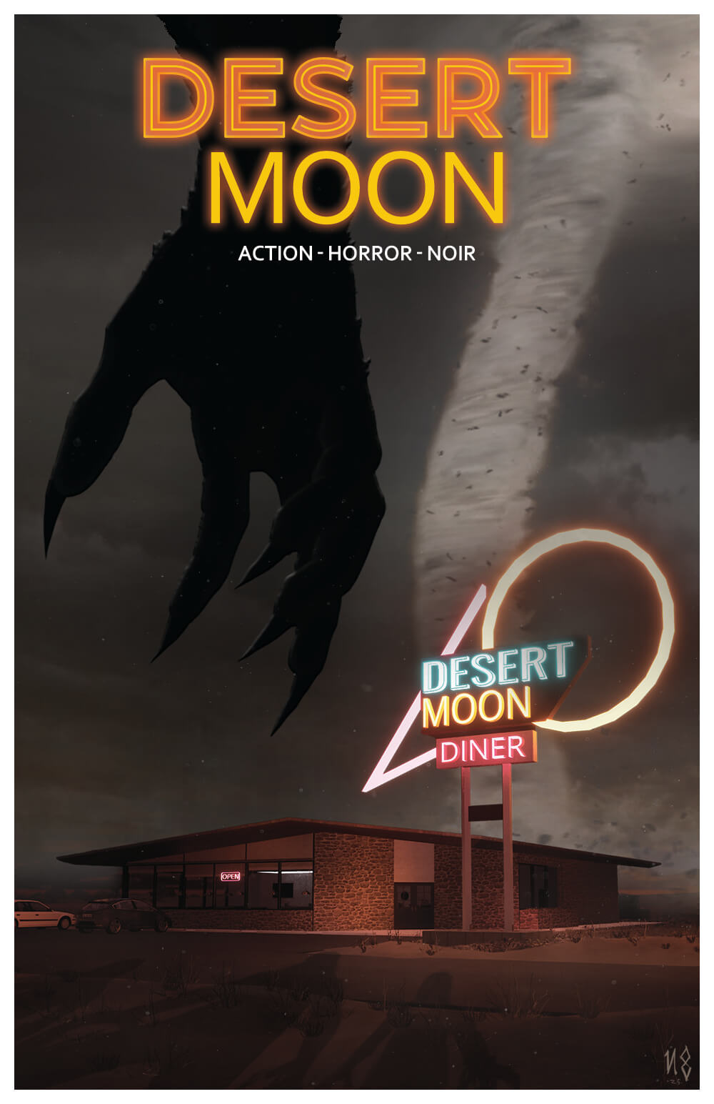 The Desert Moon graphic novel serves as a foundational piece and my "north star". This six-book series will explore the blood-soaked story where a diner full of strangers must band together and fight for their survival against tornadoes, vampire gangsters and bloodthirsty monsters.